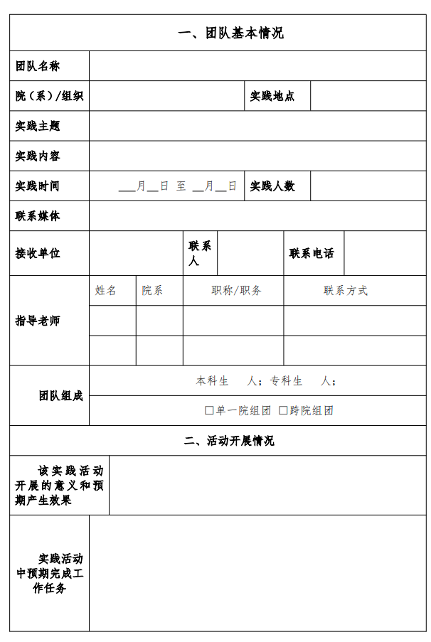 2.寒假社会实践各学院学生可个人申报、也可跨年级、 跨专业组团队申报,每个团队至少配备 1 名指导老师全程指 导参与实践活动开展。(原则上各学院不少于 200 人参加, 积极动员确保活动真实有效) 请各团队负责人和成员按照文件要求填写《社会实践个 人申报表》(附件 1)、《实践项目团队申报表》(附件 2)、 《团队信息汇总表》(附件 3)、《社会实践安全责任书》 (附件 4)并于 1 月 10 日下午 17:00 前将文件压缩包发至 m15902956381@163.com。压缩包命名格式为:活动+年级+姓 名。(注:所有团队均需在团中央“三下乡”官网中进行报 备,否则不能参与后期评优。) 各二级学院要充分认识此次实践活动的重要意义,广泛 动员学生积极参与,努力做到人人皆知,争取人人参加,认 真组织协调和指导工作,不断扩大社会实践的参与面和影响 力。