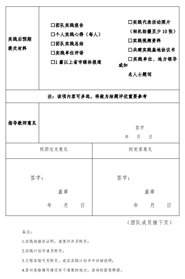 3、实践调查报告(包含实践日程内容,不少于 2000 字) 成员个人实践心得(每人不少于 500 字)。各学院 3 月 10 日前将调查报告交至校团委办公室。校团委将根据各团队实 践情况,在实践活动结束后评选优秀实践队伍及个人予以表 彰,对完成实践的学生给予第二课堂学分。